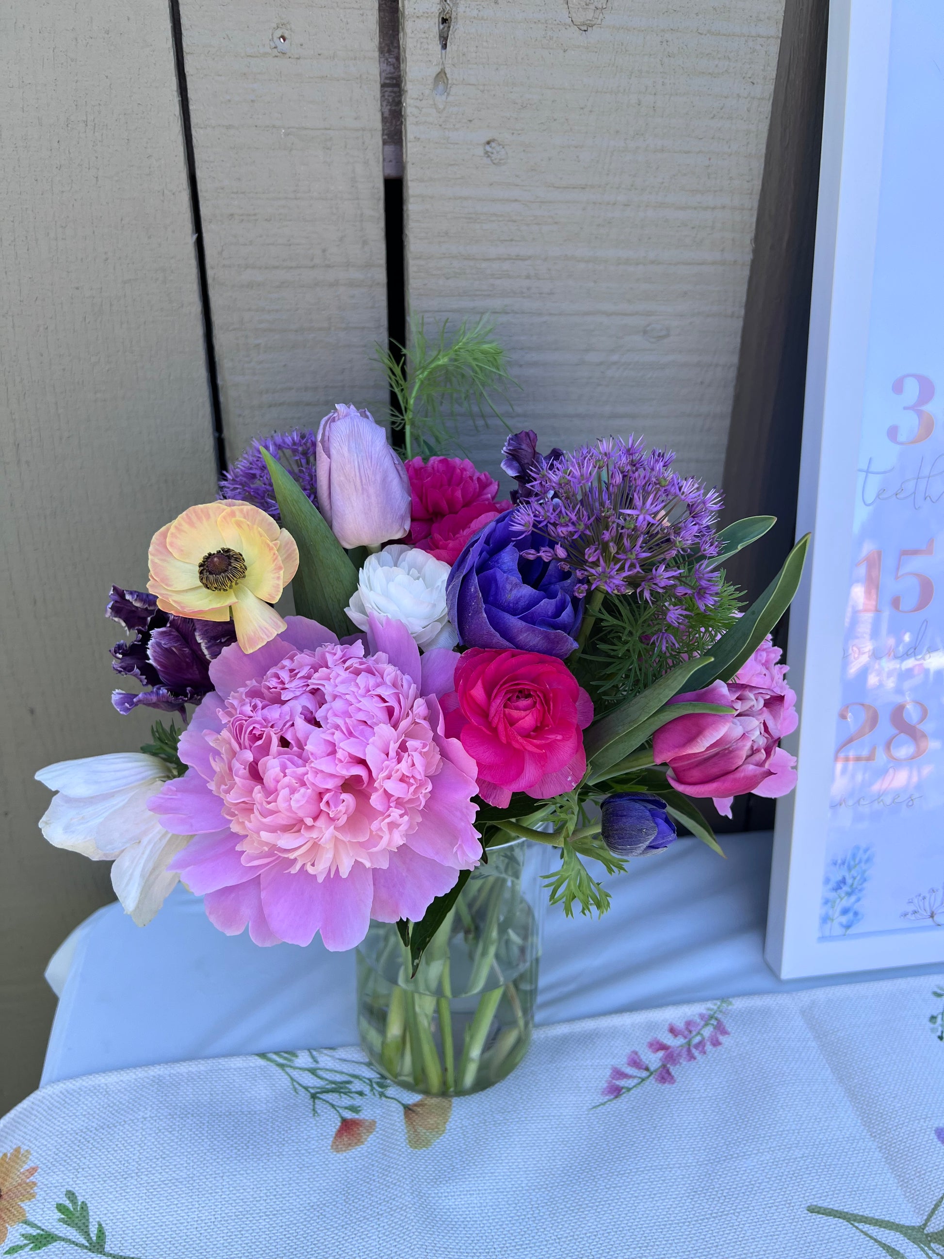 Made up of peonies, specialty tulips, alliums, ranunculus, anemones, lilies, hydrangeas, and fancy daffodils.