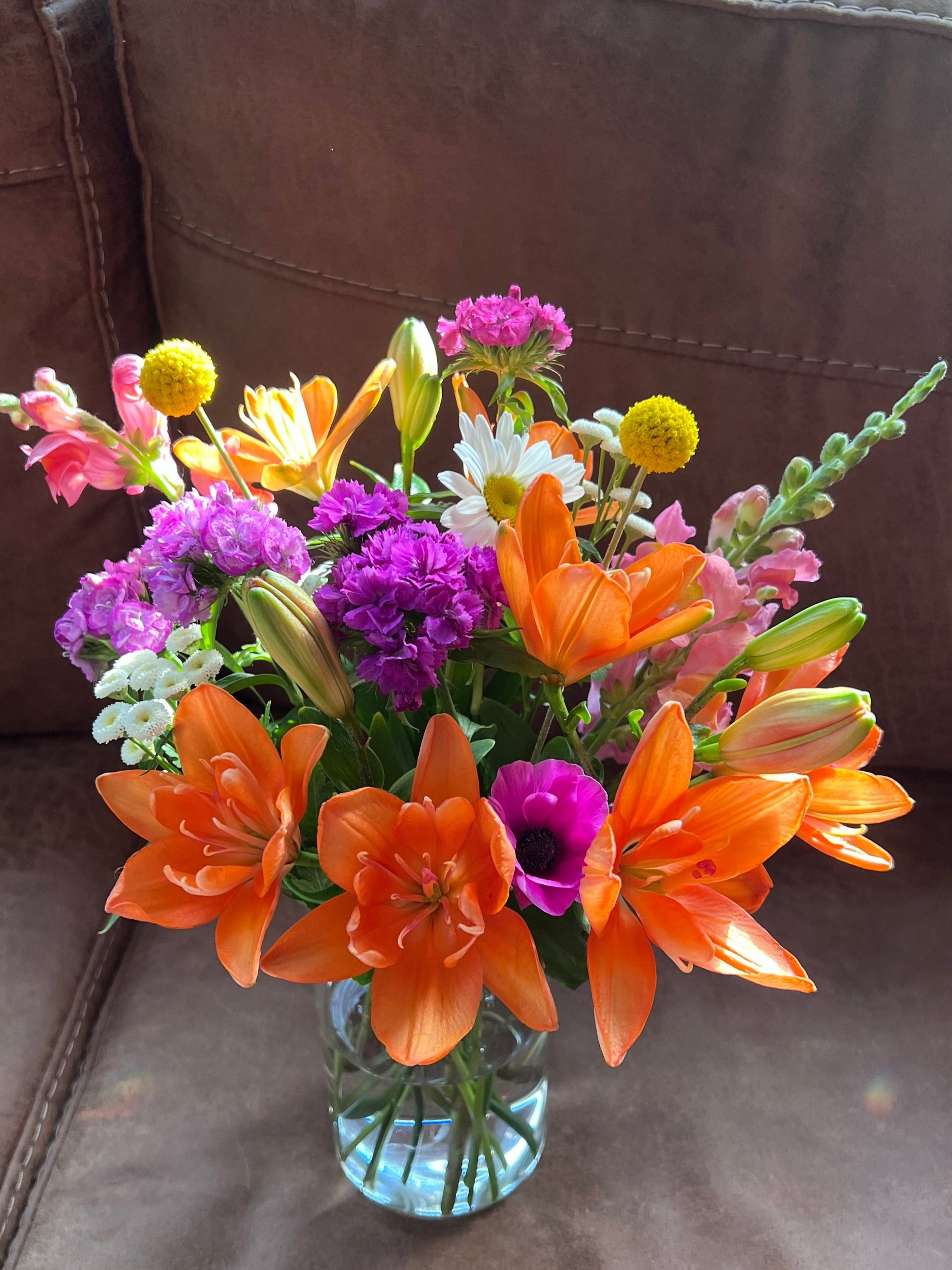 Will include a mixture of specialty dahlias, snapdragons, celosia, feverfew, asters, zinnias, sunflowers, hydrangeas, and beautiful greenery. Each week will be a little different depending on what is available!