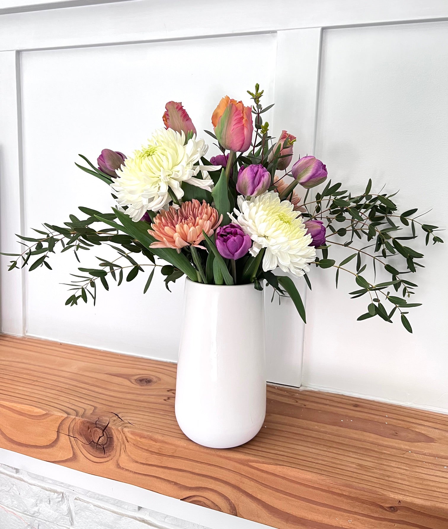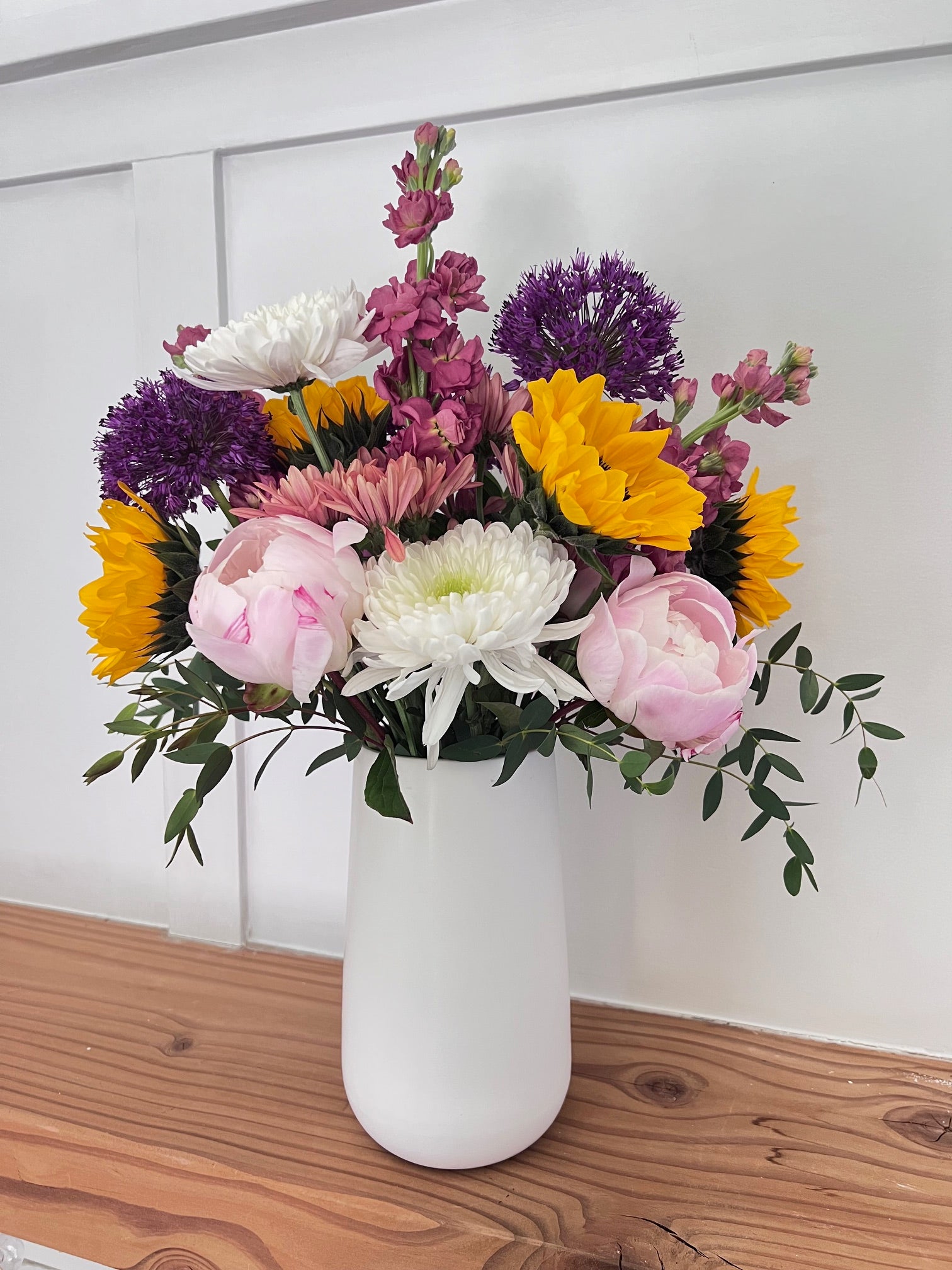 Can include a mixture of asiatic lilies, dahlias, snapdragons, celosia, feverfew, asters, zinnias, gladiolus, hydrangeas, mums, lisianthus, tulips, peonies, and beautiful greenery. Each arrangement will be a little different depending on what is available!